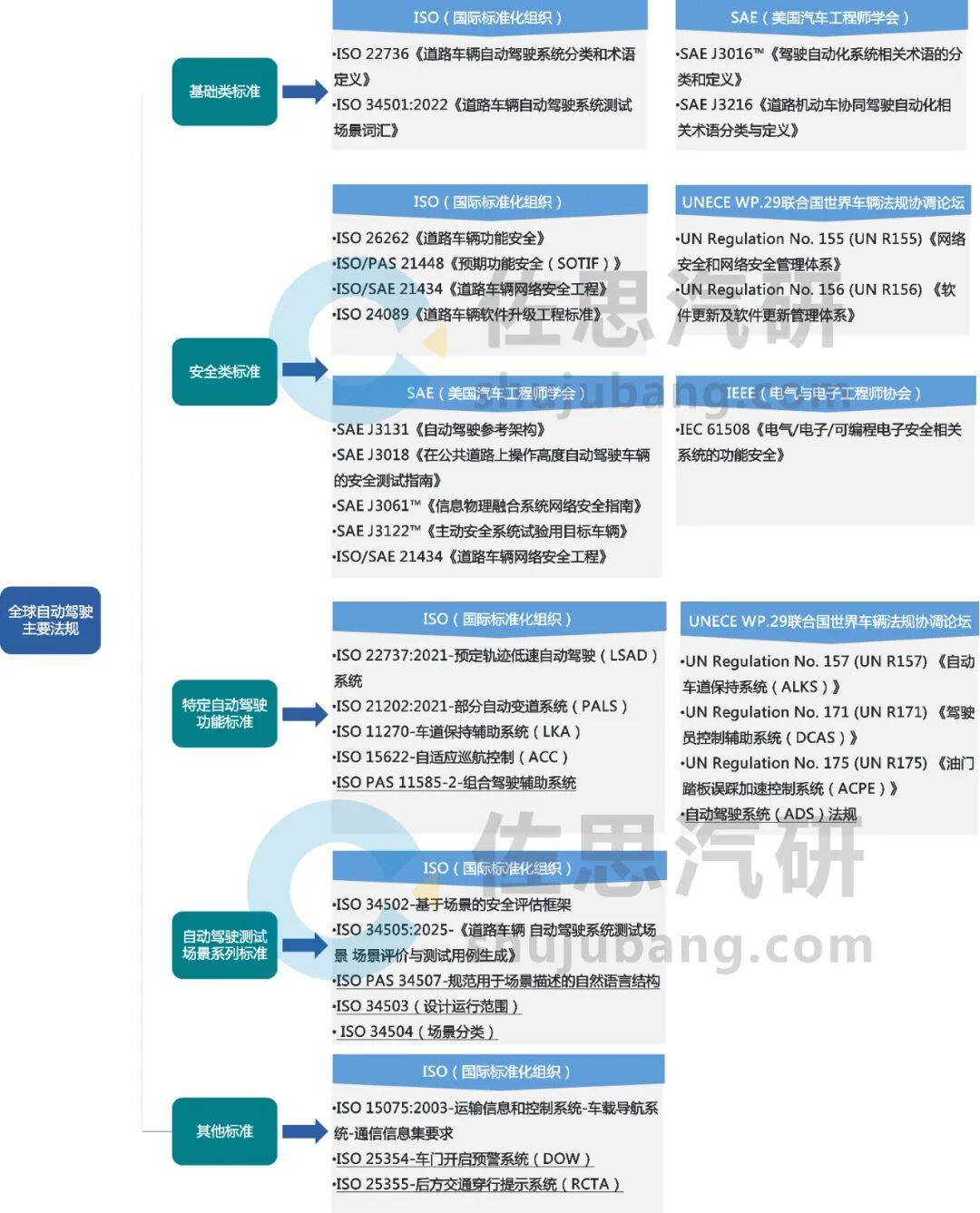 因此,剖析全球无人驾驶政策法规和各国汽车市场准入政策已成为各大车企和供应商的重点方向。根据国际标准化组织机构制定的政策,全球无人驾驶主要法规包括基础类、安全类、智驾功能类、测试场景类以及其他标准,除此以外还有市场化机构制定的技术标准,虽然不具有法律强制力,但是为无人驾驶汽车所需的通信、网络、安全等提供了关键的技术框架。